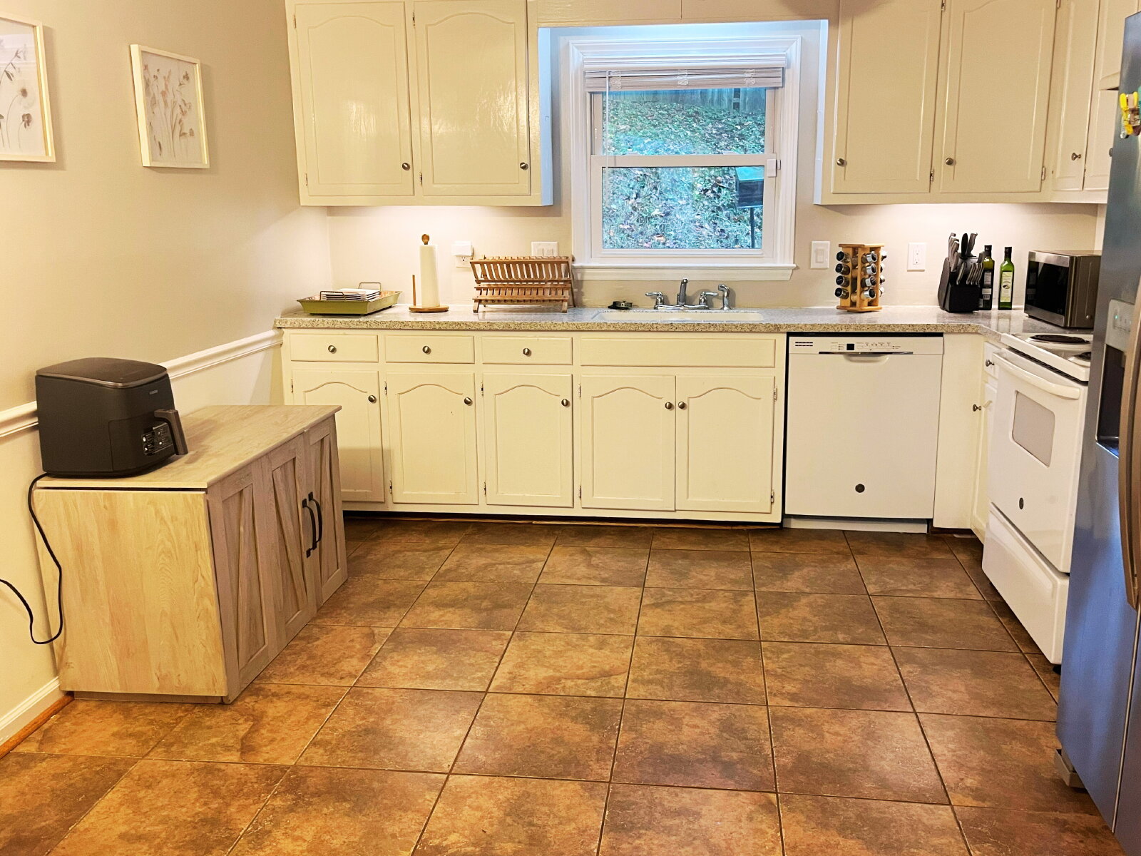 Inviting Living Space — Cozy up in the living room or entertain guests in the adjacent dining and kitchen areas, which overlook the backyard.