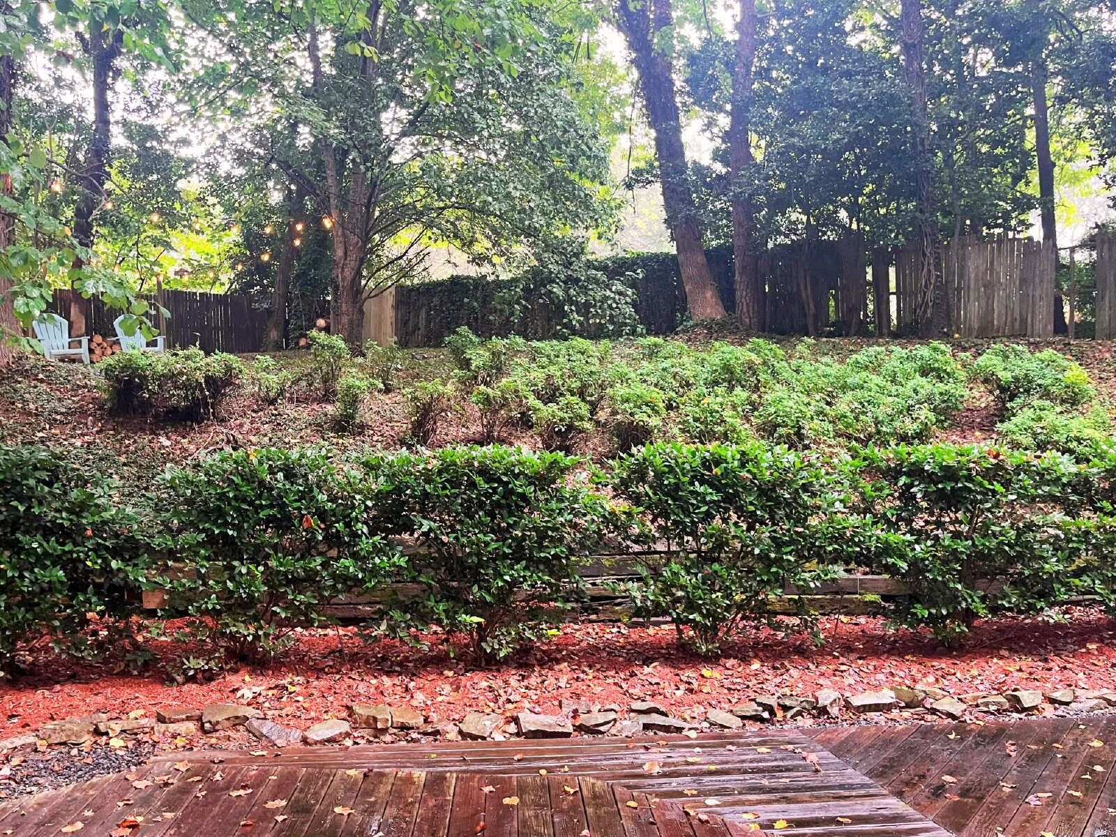 Large Lot with Outdoor Appeal — The property features a landscaped backyard, a storage shed, and a paved terrace area ideal for a fire pit.